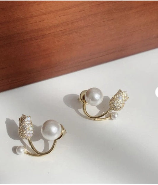 Description Beautiful Pearl Zircon Korean Flower Earrings for Women – Elegant Floral Design with Sparkling...