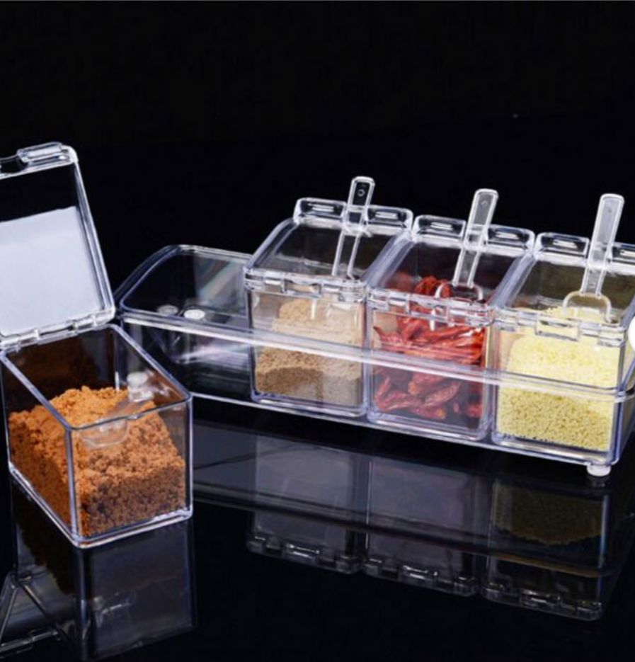 Crystal Seasoning Box With 4 Compartments And Spoons – Transparent Spice Storage Container Set For Kitchen Organization