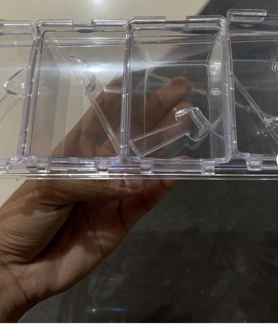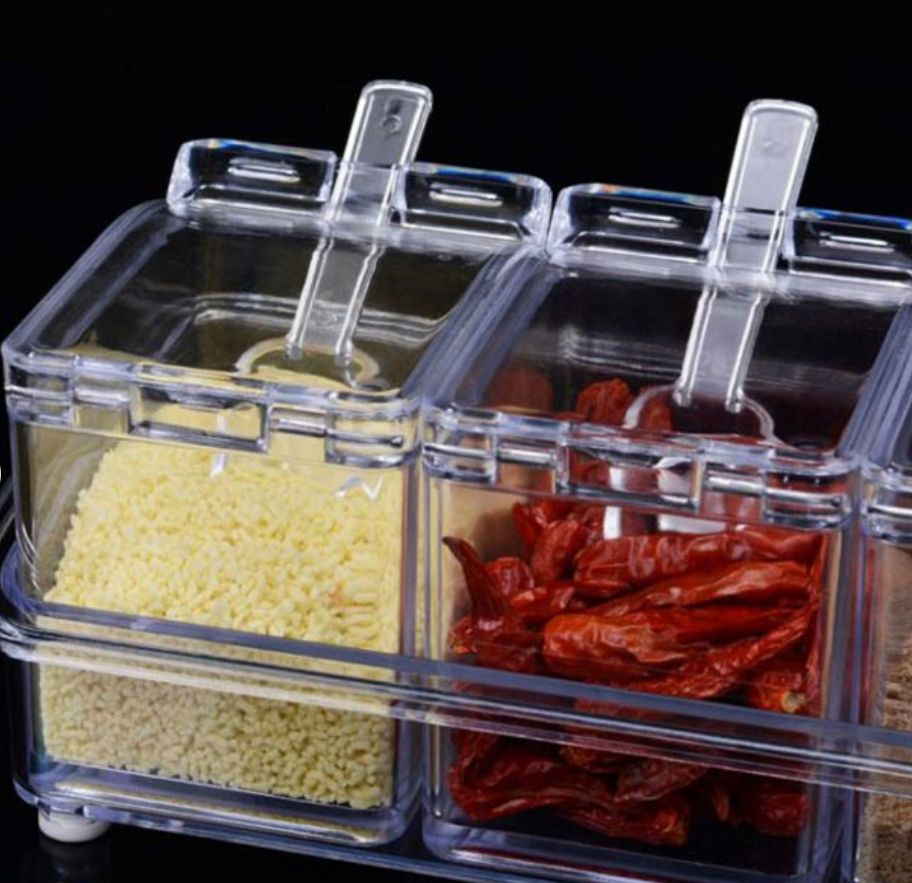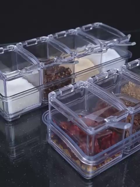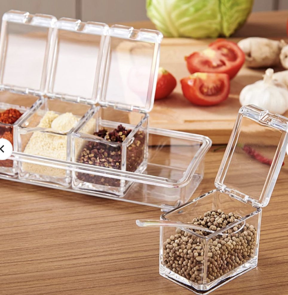 Crystal Seasoning Box With 4 Compartments And Spoons Is A Practical And Elegant Addition To Your Kitchen. Made From Durable, Transparent Material, This Spice Organizer Allows Easy Identification Of Ingredients While Keeping Them Fresh And Hygienic. Each Compartment Comes With Its Own Spoon And Lid For Convenient Use And To Prevent Mixing Of Flavors. Perfect For Storing Spices, Salt, Sugar, Or Herbs, This Compact Seasoning Box Combines Functionality With Style, Making It Ideal For Everyday Cooking Or Dining Table Use.