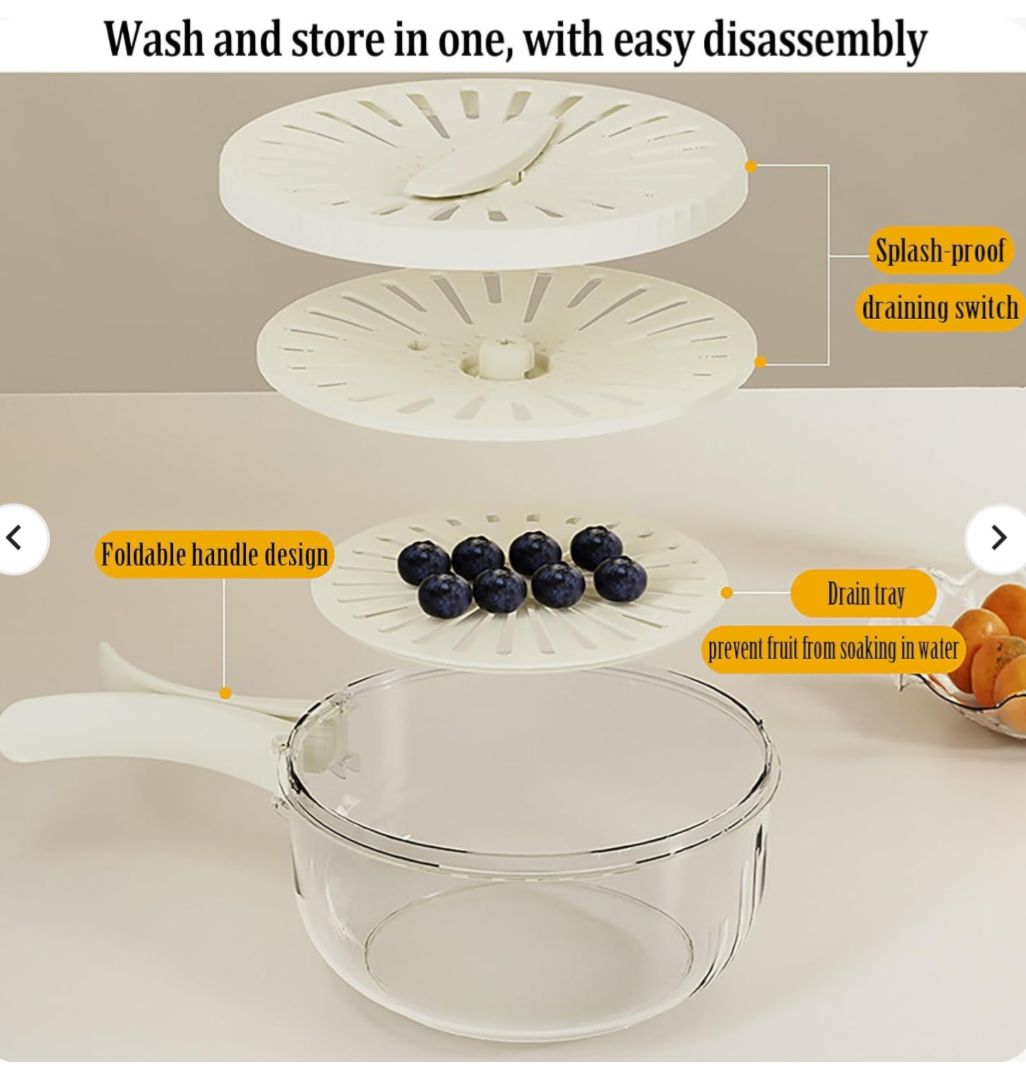 Keep your kitchen organized and your fruits and vegetables fresh with this multifunctional kitchen fruit drainage basket. Designed with a dual-layer system, it allows you to wash, drain, and store in one convenient bowl. The drain tray prevents fruits from soaking in water, keeping them crisp and fresh, while the splash-proof draining switch ensures easy water release without mess. Its foldable handle design makes it space-saving and easy to store, while the transparent bowl with lid doubles as a storage container for the fridge or countertop. Perfect for rinsing berries, leafy greens, or vegetables, this versatile bowl is a must-have for every modern kitchen.